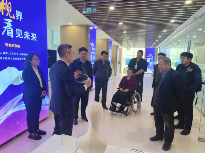 李国都理事长一行参观科技助残展区,重点考察了盲道铺设技术、智能助盲帽及AR字幕眼镜等创新产品。讲解员详细介绍了盲道在防滑材质和连续性设计方面的技术改进,并现场演示了智能助盲帽的实时环境感知与语音导航功能,展示了该设备如何有效提升视障人士的独立出行能力。在AR字幕眼镜展区,工作人员重点演示了语音实时转写功能,通过实际场景模拟展现了该技术对听障人士日常交流的辅助效果。展区产品充分展现了科技创新在无障碍环境建设中的重要作用,为促进残障人士社会融入提供了切实可行的技术解决方案。